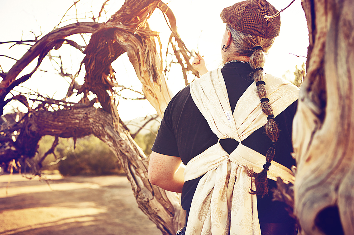 KB. I started babywearing when my LO was born because my partner Erin started babywearing with our older son. He is not my bio but he is my son. I started with a Moby wrap and then got into wovens and fell in love. Babywearing has helped me create a bond with my LO that is amazing. Erin and I also realized that our older son still loves being worn and it helps him re-center and calm his body.